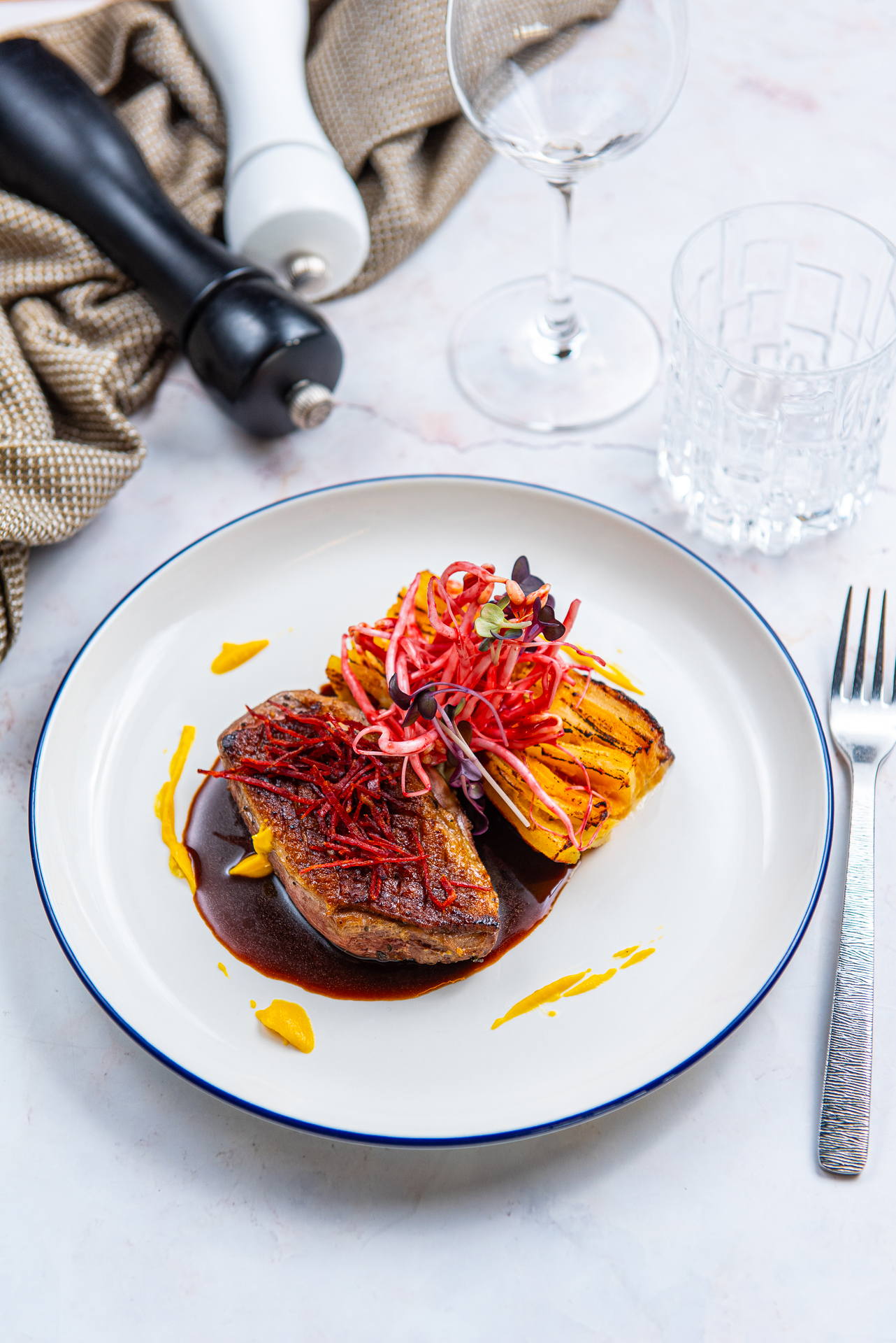 BBQ duck fillet with musk pumpkin au gratin, rowanberry and red wine jus